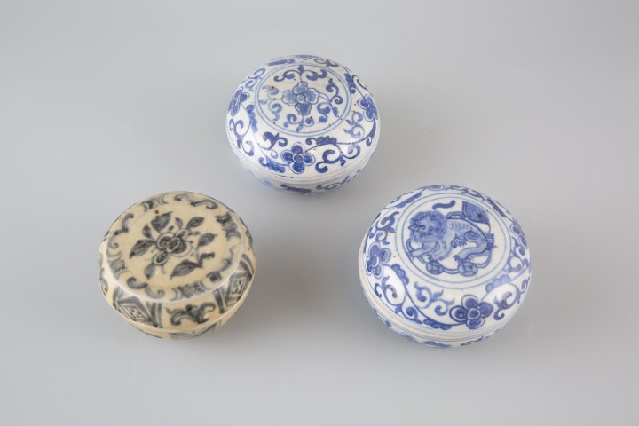 Estimation:300/400 CHINE – Dynastie MING (1368 – 1644). Trois boites rondes en porcelaine bleu blanc à décor de fleurs de lotus et lions. Diam. 7,5 et 8 cm. Expert : Cabinet Portier, Paris.