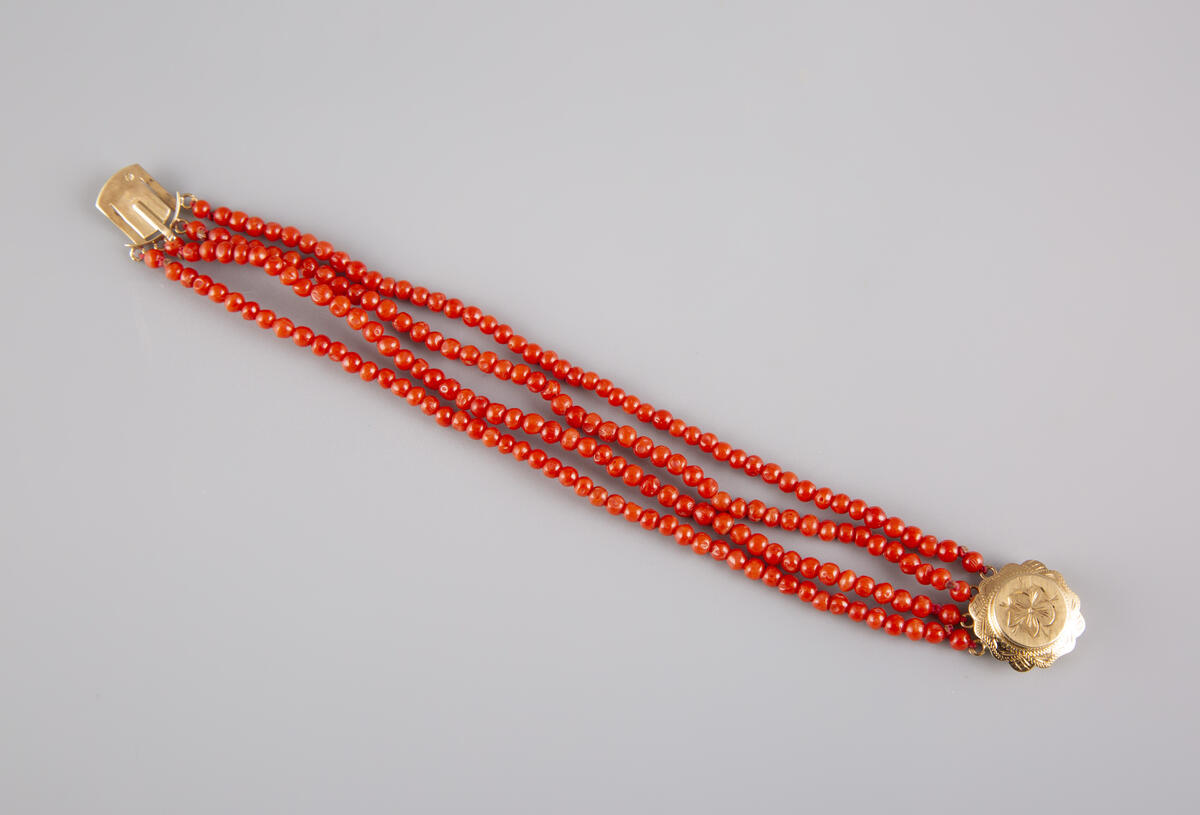 Estimation: 150/250 – Bracelet quatre rangs de perles de corail avec son fermoir en or jaune 14K 585°/°°, poinçon hibou, ciselé