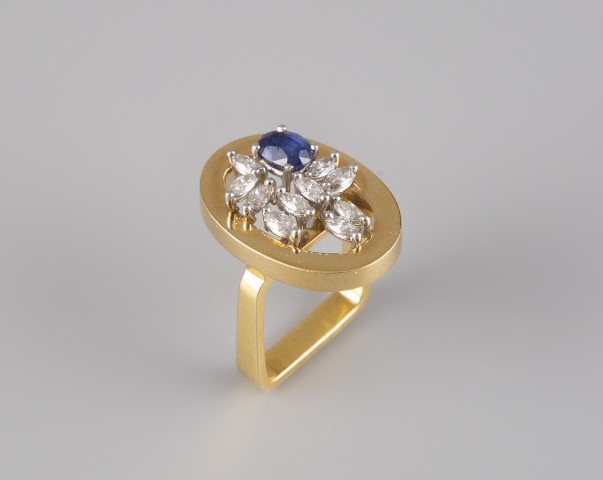 Estimation: 500/600 – Bague en or jaune 18k 750°/°°, poinçon hibou et 750, à plateau ovale serti d’un saphir ovale et de 10 diamants de taille navette, anneau carré