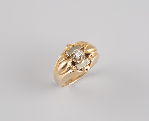 Estimation:300/400 Bague de style art déco en or jaune 18K 750°/°°, poinçon hibou, sertie d’une pierre blanche en son centre. Tour de doigt 58. Poids brut 5,31g.