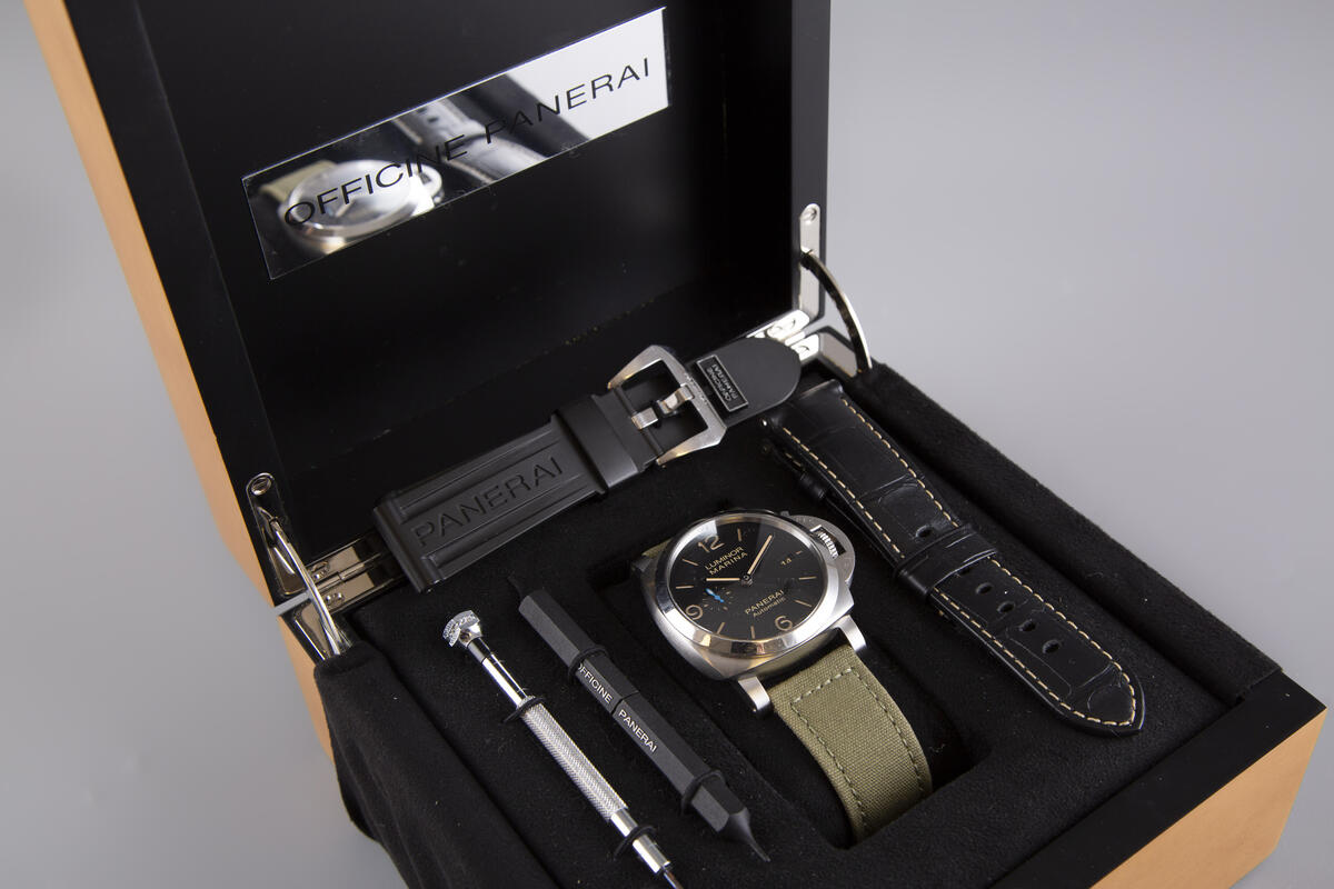 Estimation:3000/5000 PANERAI. Montre d’homme en acier, modèle marina Luminor 1950 3d, cadran rond à fond noir, chiffres arabes et aiguilles luminescents, trotteuse à 9h, dateur à 3h, mouvement mécanique à remontage automatique. Bracelet rapporté en cuir et tissu kaki à boucle ardillon. Ref Pam 01312. OP7056. edition limitée numérotée T1309/5000. Full set.