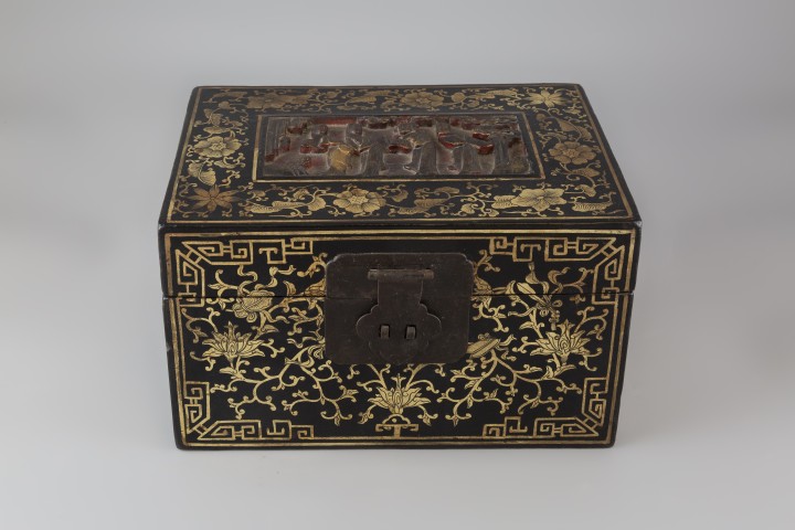 Estimation:100/150 CHINE – Vers 1900. Boite de forme rectangulaire en laque noir et or à décor de fleurs de lotus dans leur feuillage et frises de grecques, le couvercle en bois sculpté de personnages. Dim. 17 x 28,5 x 21 cm. Expert : Cabinet Portier, Paris.