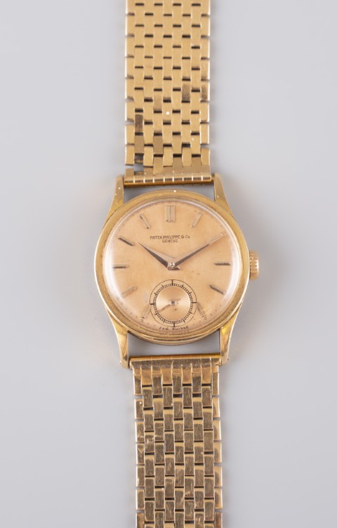 Estimation:3500/4000 PATEK PHILIPPE. Montre en or 18k 750°/°°, modèle Calatrava, cadran rond à fond rosé, index baton, chrono à 6h, bracelet rapporté en or articulé à maille geométrique, boucle coulissante à 3 crans. Numéro 829732. Mouvement mécanique à remontage manuel. Poids 68,03g. Acheté vers 1952. Gravée sur le fermoir, un maillon manquant.