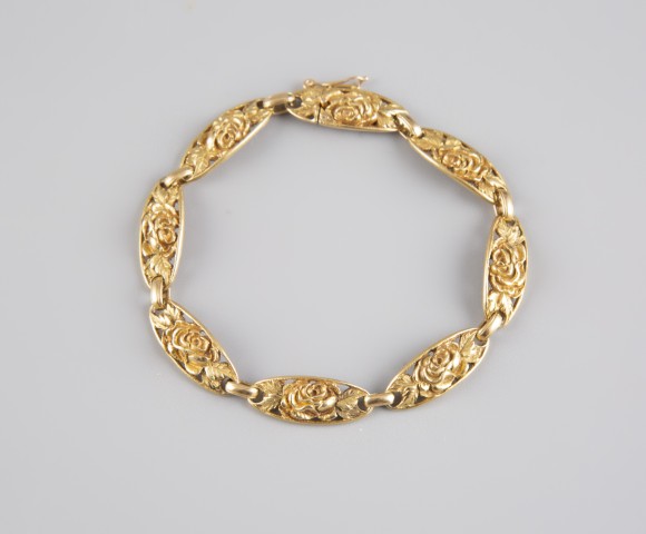 Estimation: 800/900 – Bracelet en or jaune 18K 750°/°°, poinçon tête d’aigle, à maille articulé à motif de roses