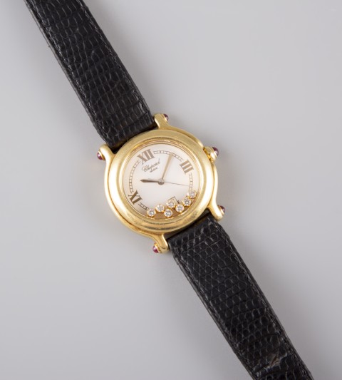 Estimation:4600/4800 CHOPARD. Montre en or jaune 18k 750°/°°, poinçon 750, modèle Happy Sport, cadran rond à fond creme, index en chifffres romains, 7 diamants serti clos mobile dans le cadran. Bracelet cuir à boucle ardillon Chopard en or. Mouvement quartz. Pile changée. En état de fonctionnement. Poids brut 57g.