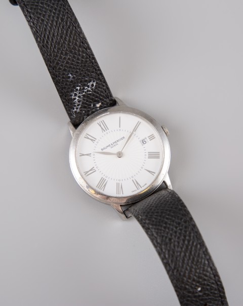 Estimation:400/500 BAUME & MERCIER. Montre en acier, modèle Classima, cadran rond, fond crême, date à 3h. Bracelet cuir, boucle ardillon siglée. Mouvement quartz. Vendue avec sa boite, papier et garantie. Achetée en 2017. Pile changée. En état de fonctionnement.