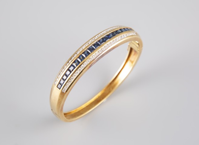 Estimation: 1500/2500 – Bracelet jonc en or jaune 18k 750°/°°, poinçon 18k et hibou, à ouverture latérale, serti au centre d’environ 3 carats de saphirs calibrés en chute épaulés de deux lignes de diamants taille brillant sertis rail pour un total d’environ 1,10 ct