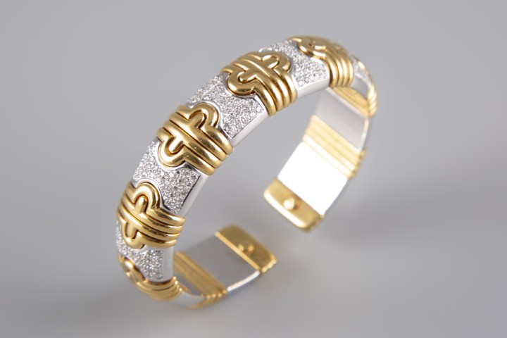 Estimation: 3000/5000 – Bracelet semi rigide en or jaune 18K 750°/°°, poinçon 18k et 750, composé d’une succession de motifs imbriqués les uns aux autres dont certains pavés de diamants taille brillant pour un total d’environ 2,20 carats