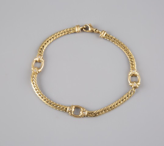 Estimation: 250/300 – Bracelet en or jaune 18k 750°/°°, poinçon tête d’aigle, orné de trois motifs ovale sertis de brilants