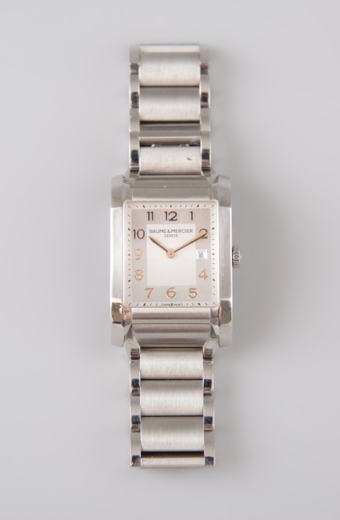 Estimation:200/300 BAUME & MERCIER. Montre en acier, modèle Hampton, cadran rectangle à fond bicolore, index chiffres arabes, date à 3h. Mouvement quartz.