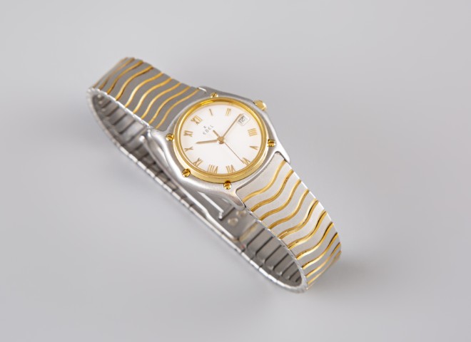 Estimation:300/400 EBEL. Montre en or et acier, modèle Classic, cadran rond fond blanc, index chiffres romains, date à 3h, bracelet boucle déployante. Vendue avec sa pochette de transport et deux maillons supplémentaires.