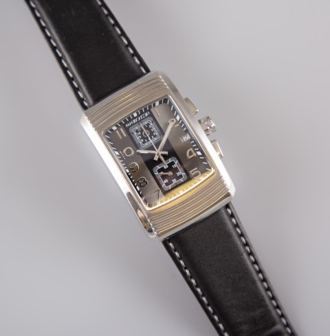 Estimation:80/100 MAUBOUSSIN. Montre en acier, modèle Energie Vitale, cadran rectangle bi-ton gris ardoise et noir, compteur heure et seconde, chronographe, date à 3h. Couronne cage enfermant une pierre rose. Deux boutons poussoirs. Fond vissé signé et numéroté. Bracelet en cuir noir avec boucle ardillon signée. Mouvement à quartz.