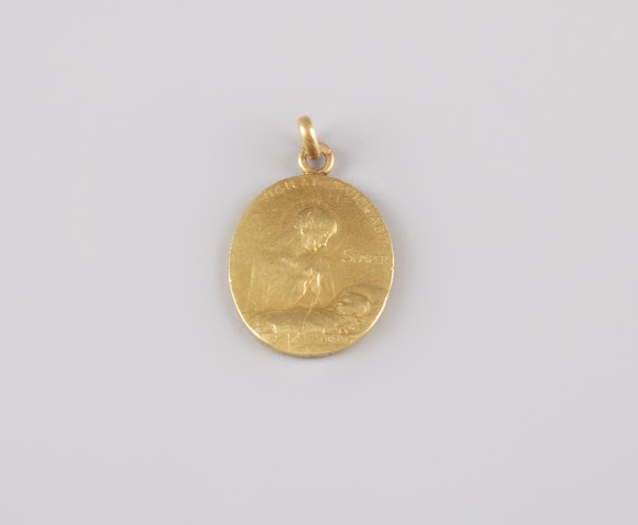 Estimation:200/300 Médaille de la vierge en or jaune 18k 750°/°°, poinçon hibou, gravé d’un coté d’une vierge à l’enfant et d’un décor floral au dos. Hauteur 2,5cm. Poids 4,50g.
