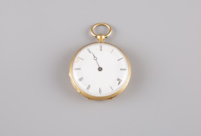Estimation: 200/300 – Montre de col en or jaune 18K 750°/°°, poinçon hibou, cadran fond blanc à chiffres romains, dos émaillé bleu