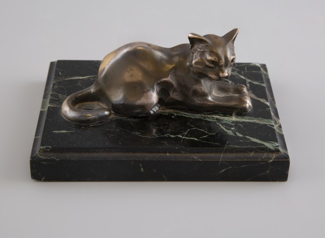 Estimation:150/200 Emmanuel André BOURCARD (XX°). « Chat au repos ». Epreuve en métal sur socle en marbre vert. 4,5x11x5cm (hors socle)