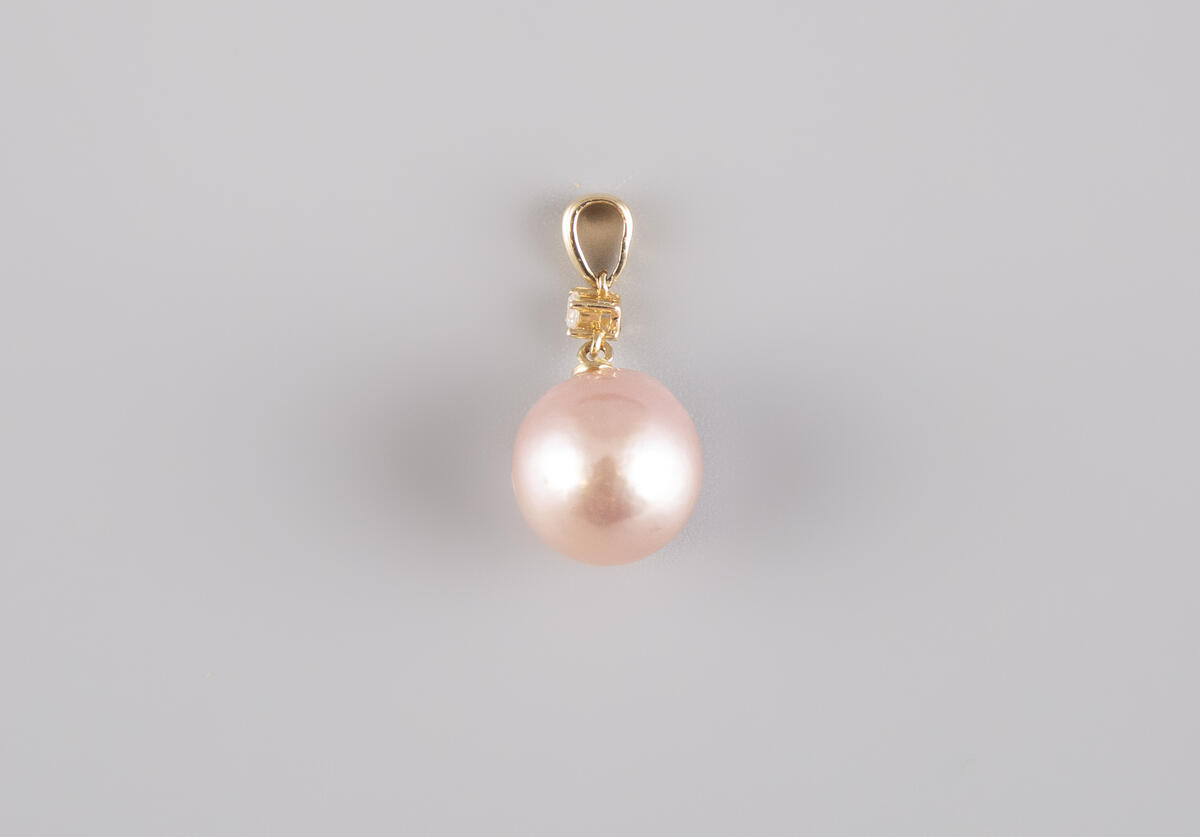 Estimation:120/180 Pendentif en or jaune 14K 585°/°°, poinçon Coquille St Jjacques, et diamant, orné d’une perle de culture rose « mer du sud ». Certificat World Gemological Institut. Poids 2,1g.