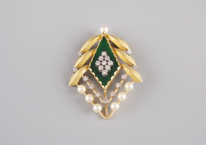 Estimation:1200/1500 Pendentif en or jaune, 18K 750°/°°, à palmette, le centre sertie d’une pierre verte réhaussée de diamants taille brillant. La partie basse de diamant taille brillant et de perles. H4,5 cm. Poids 16g