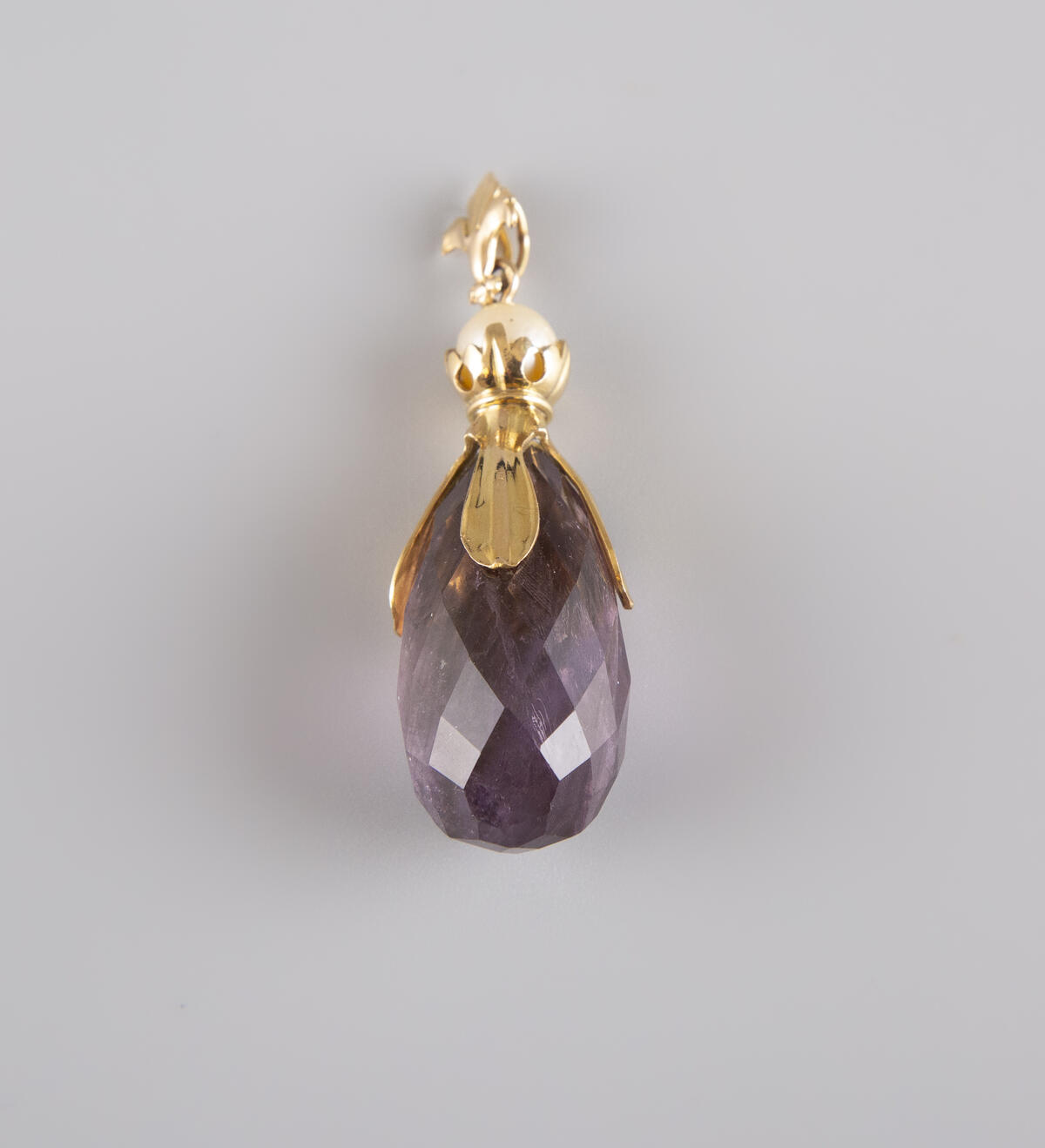 Estimation: 500/600 – Pendentif goutte en or jaune 18k 750°/°°, poinçon hibou, importante améthyste de forme goutte réhaussée d’une perle de culture, bélière fleur de lys