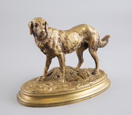 Estimation:300/400 Alfred BARYE (1839-1882). « Chien à l’arrêt ». Epreuve en bronze à patine dorée signée sur la terrasse. 17x22x12cm