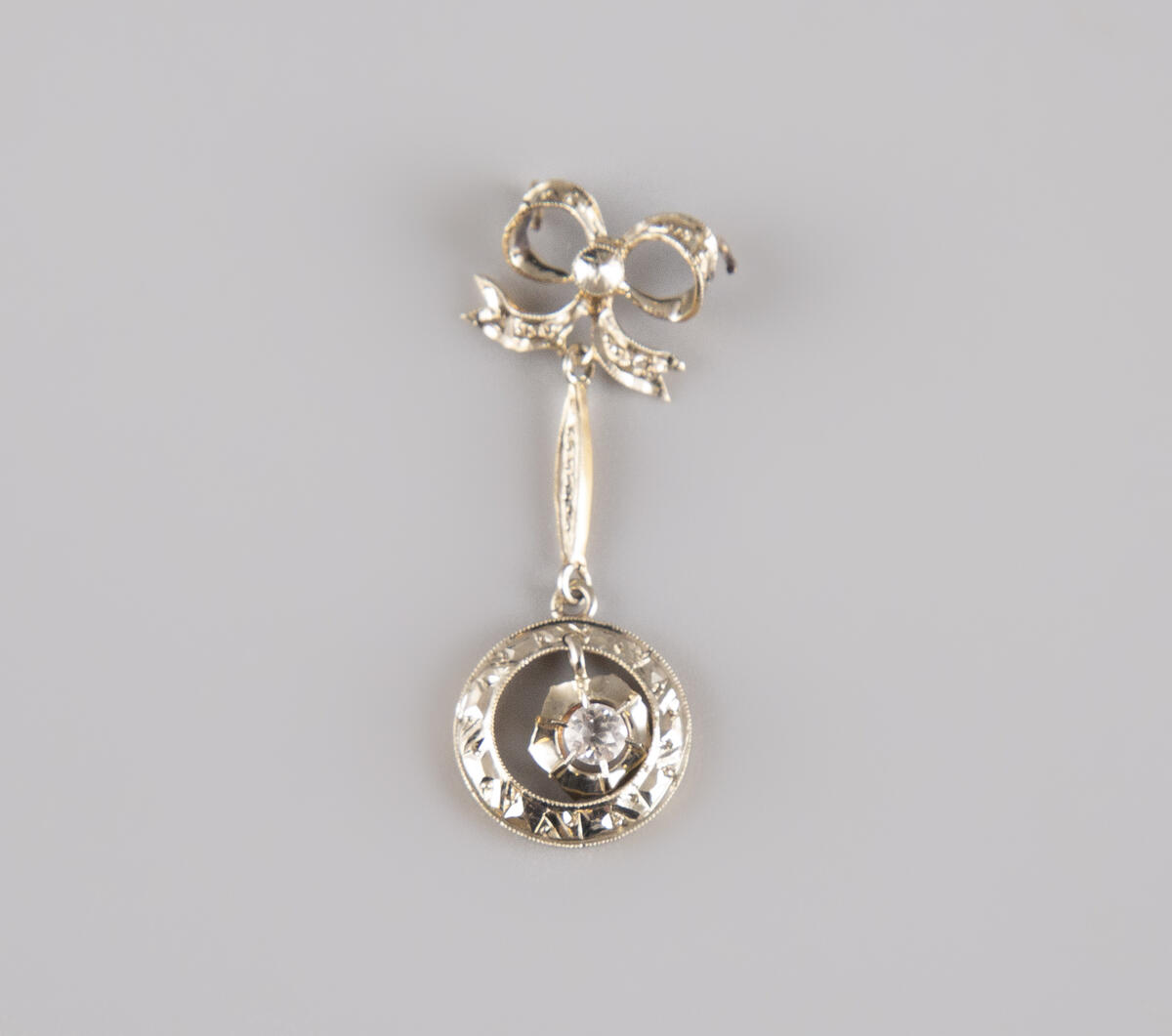 Estimation:150/200 Pendentif rétro en or bicolore 18k 750°/°°, poinçon tête d’aigle, sertie d’une pierre blanche. Bélière formant noeud. Longueur 3cm. Poids brut 1,50g.