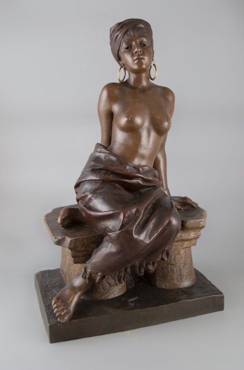 Estimation:500/800 Emmanuel VILLANIS (1858-1914). « La Captive ». Belle épreuve en bronze à patine médaille brun, brun-rouge et or, signée sur la terrasse. 63x35x24cm. Expert : Cabinet Chanoit, Paris.