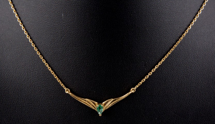 Estimation: 200/300 – Collier en or jaune 18K 750°/°°, poinçon tête d’aigle, serti au centre d’un motif centré d’une émeraude