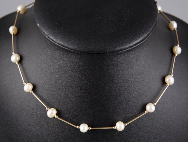 Estimation: 60/80 – Collier articulé en or jaune 14K 585°/°°, poinçon 14K, alterné de perles de culture