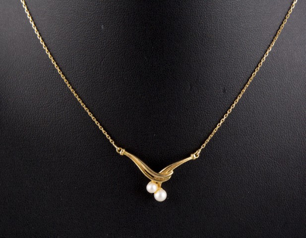 Estimation: 100/120 – Collier en or jaune 18k 750°/°°, poinçon 750, et son motif central orné de deux perles