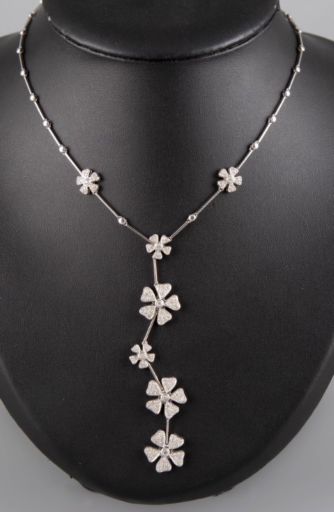 Estimation: 1600/2000 – Collier articulé en or blanc 18k 750°/°°, poinçon 18k, serti de sept motifs floraux diamantés pour un poids total d’environ 1,25cts