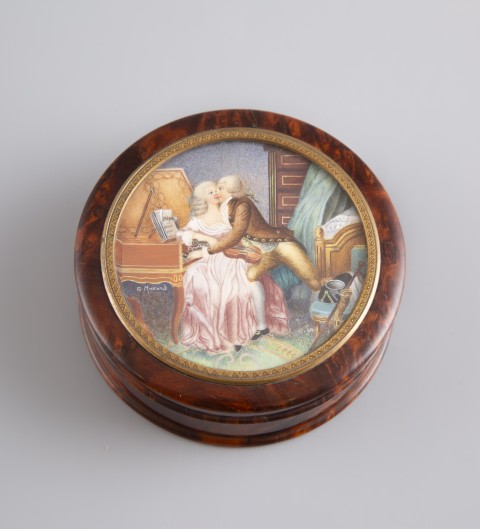 Estimation: 30/50 – Boîte couverte de forme ronde en loupe ornée d’une miniature peinte et d’une scène érotique