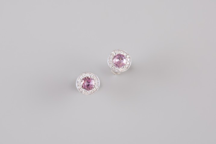 Estimation: 100/200 – Puces d’oreilles soleil, en or blanc 18k 750°/°°, centrées de saphirs rose (env