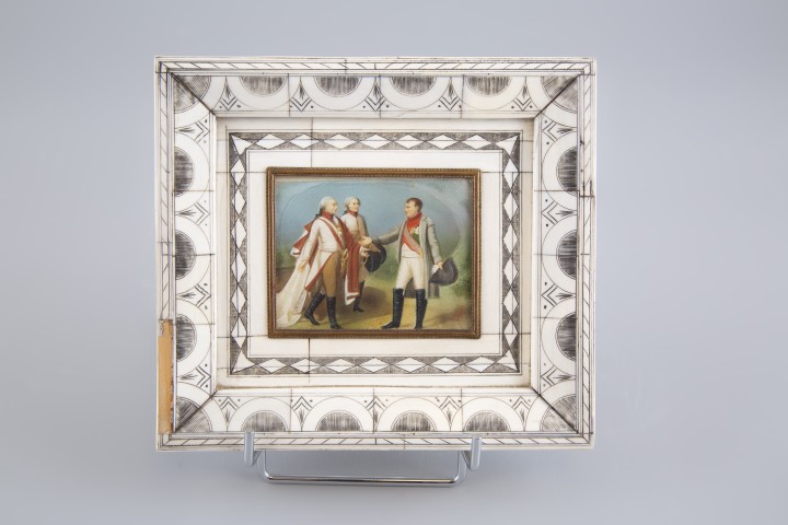 Estimation:200/300 Ecole française XIX°. Miniature, représentant Napoléon recevant des généraux. Cadre en os gravé ( accidents). (7X9cm).