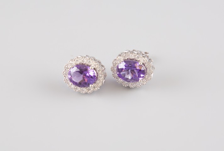 Estimation: 250/450 – Boucles d’oreilles en or blanc 18k 750°/°°, poinçon 750 et hibou, chacune sertie d’une améthyste ovale d’environ 1,60ct ceinturée d’environ 0,30ct de brillants