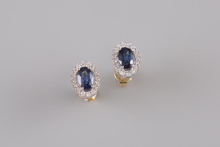 Estimation: 100/200 – Puces d’oreilles ovalisées, en or bicolore 18k 750°/°°, serties de saphirs bleus (env 0,87ct) et brillants (env 0,20ct)