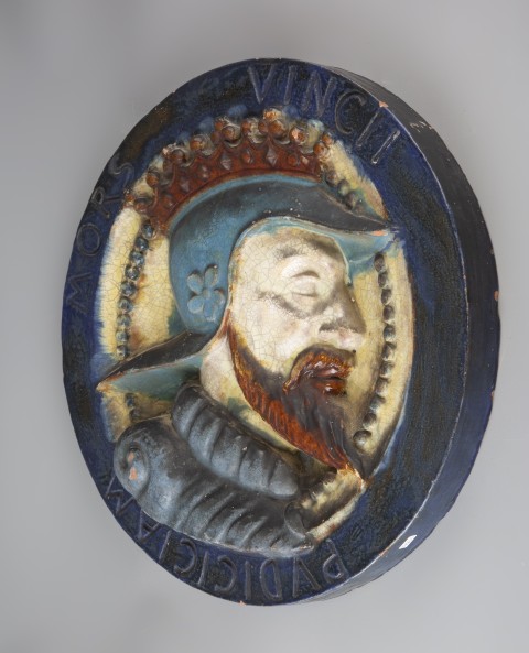 Estimation:200/300 Ecole de Paris, fin XIXe siècle. Tondo d’applique en terre cuite modelée & vernissée. Profil d’un roi guerrier en armure, harmonie bleue sur fond jaune, sur l’aile, extrait d’une citation latine approximative, signifiant « la mort triomphe toujours ». D.: 49 cm. Petits manques d’émail (épaule) & petits éclats. Expert : Anne Lajoix, Paris.