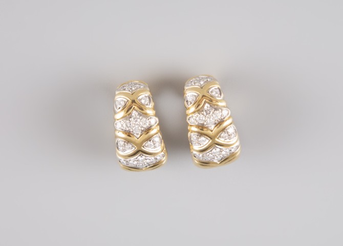 Estimation:1300/1400 LIZHEL. Paire de boucles d’oreille en or jaune 18k 750°/°°, poinçon tête d’aigle, à motif tressé alterné de motifs pavés de diamants. Poids brut 17,56g.