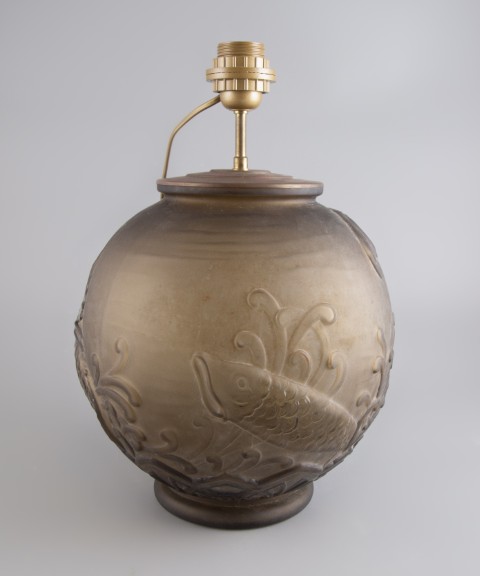 Estimation:150/200 LORRAIN. Important vase boule en verre épais moulé pressé satiné à décor soufflé de poissons évoluant au dessus d’un fond marin. Signé. Vers 1930. H: 28.5 cm. (LORRAIN – décrété filiale des frères DAUM, installée à Croismare, près de Lunéville de 1925 à 1934).