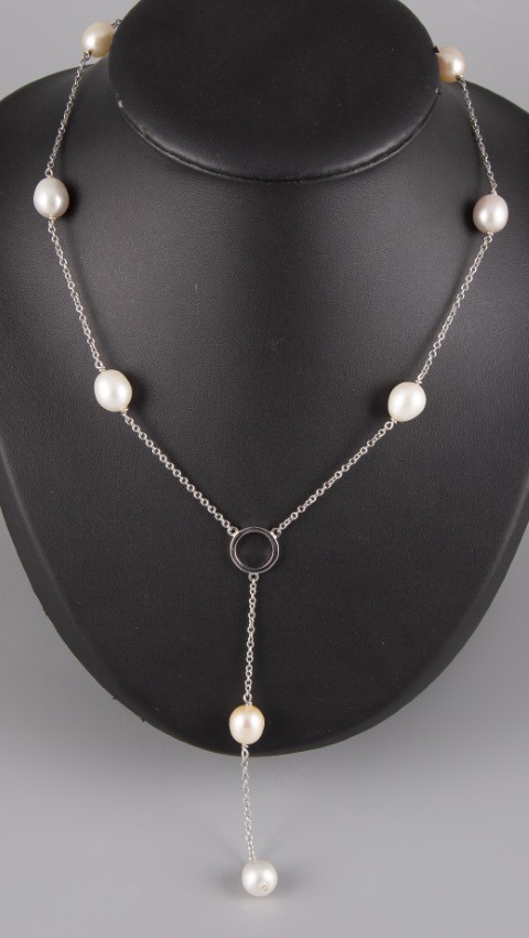Estimation: 120/150 – Collier cravate en or blanc 18K 750°/°°, poinçon 750, alterné de perles d’eau douce