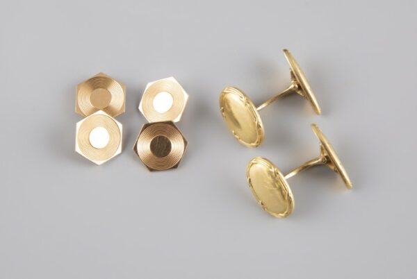 Estimation: 300/400 – Lot de deux paire de boutons de manchette en or jaune 18k 750°/°°, poinçon tête d’aigle, l’une à décor hexagonal et l’autre ovale
