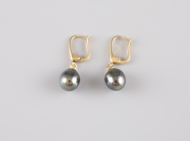 Estimation:150/200 Paire de boucles d’oreille en or jaune 18K 750°/°°, poinçon 750 et hibou, sertie de perles de tahiti. Longeur 3cm. Poids brut 5g.