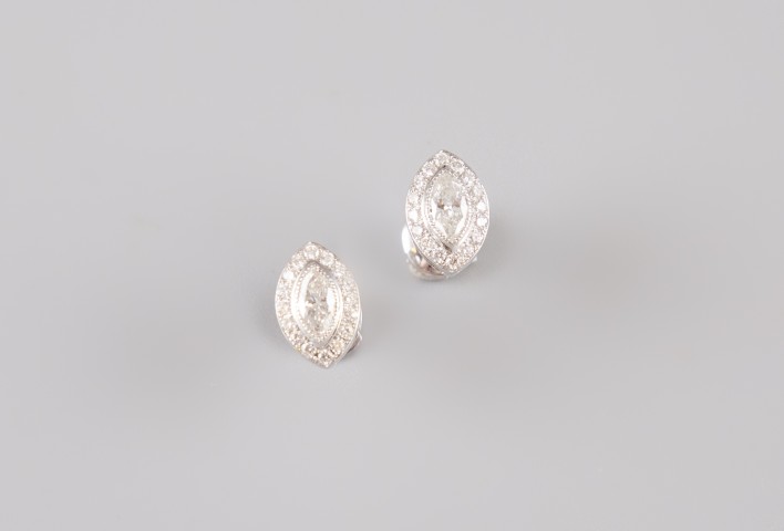 Estimation:200/400 Boucles d’oreille en blanc 18k 750°/°°, poinçon hibou, sertie de diamants marquise (env. 0,60ct) et brillants (env. 0,30ct). Hauteur 1,1cm. Poids brut 3,18g. Certificat fourni.