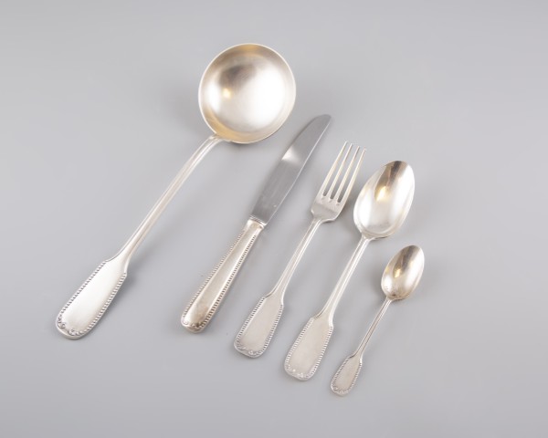 Estimation:80/120 SAINT MEDARD. Partie de ménagère en métal argenté, modèle Perles, comprenant 47 pièces : 12 couverts de service (12 couillères et 12 fourchettes), 12 couteaux, 10 petites cuillères et une louche.
