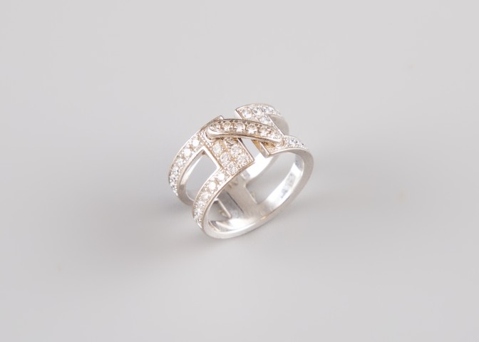 Estimation:1700/1800 CHAUMET. Bague en or blanc 18k 750°/°°, poinçon tête d’aigle, modèle Lien, pavée de diamants taille brillants. Tour de doigt 51. Poids brut 7,4g.