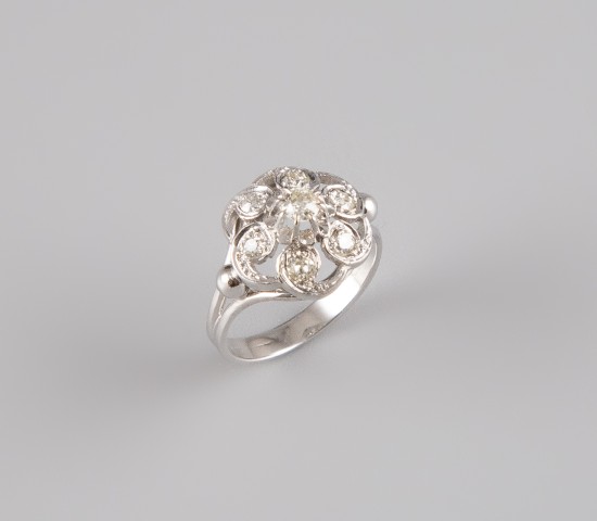 Estimation: 450/500 – Bague fleur en or blanc 18K 750°/°°, poinçon tête d’aigle, sertie de sept diamants taille brillant pour un poids total d’environ 0,50ct