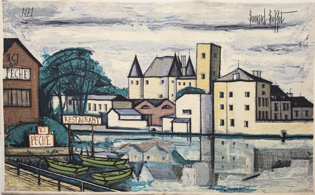 Estimation:400/500 Bernard BUFFET (1928-1999) « Nemours, Le château et les bords du Loing » 1971. Tapisserie murale dite Tapisserie Ornemur, imprimée à la main sur étoffe de laine, éditée par la maison Corot à Paris, signée dans la trame en haut à droite et datée en haut à gauche, titrée, désignée, portant la signature manuscrite de