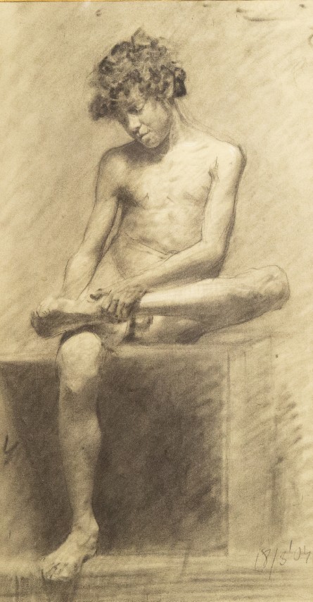 Estimation:50/100 Ecole française Fin XIX , début XX°. « Etude de jeune garçon assis ». Mine de plomb et craie blanche, datée en bas à droite. 42x23cm (à vue). Expert : Cabinet Chanoit, Paris.