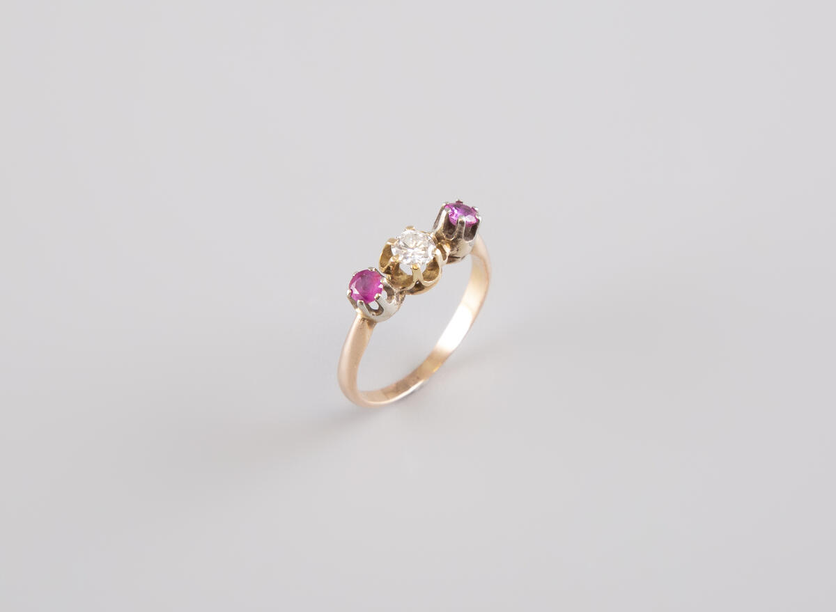 Estimation: 100/200 – Bague ancienne en or rose 14K 585°/°°, poinçon coquille St jacques, sertie d’un diamant d’environ 0,20ct, entourage rubis
