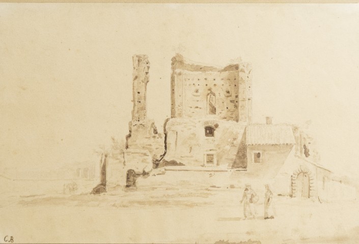 Estimation:200/300 Constant BOURGEOIS (1767-1841) « Ruines de la fontaine du Nymphée d’Alexandre à Rome », vers 1800. Lavis sur papier, monogrammé CB en bas à gauche. 17,5×26 cm. Encadré sous verre.