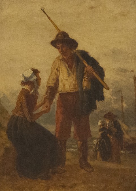 Estimation:80/120 Ecole française XIX°. « Les adieux des pêcheurs à leurs épouses « . Huile sur toile monogrammée et datée 1895 en bas à droite. 33,5x25cm. Expert : Cabinet Chanoit, Paris.