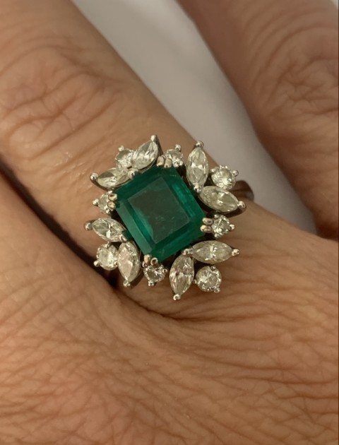 Estimation: 1800/2000 – Bague marguerite en or blanc 18k 750°/°°, poinçon 750, sertie en son centre d’une émeraude taille émeraude d’environ 1,50cts entourée de diamants taille navette et brillants pour un total d’environ 1cts